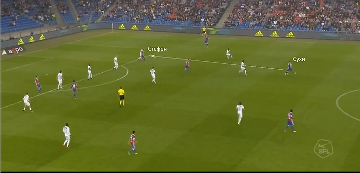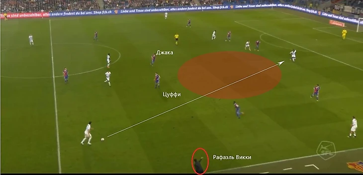 Фактически, пять игроков атаки и полузащиты остаются отрезанными одной передачей. И на границе штрафной соотношение атакующих и обороняющихся 5 к 5. Рафаэль Викки активно указывает на эту зону, куда, видимо, должен оттянуться Цуффи.