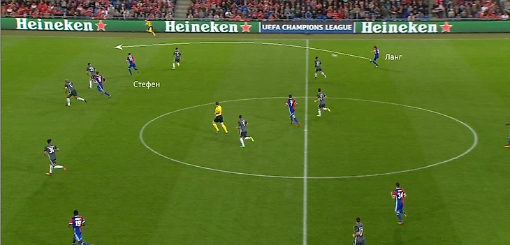 На этом фото это приводит к тому, что если крайний защитник Базеля, который выдергивается на адресата передачи, будет отыгран, то вся левая бровка поступит в распоряжение атаки соперника.