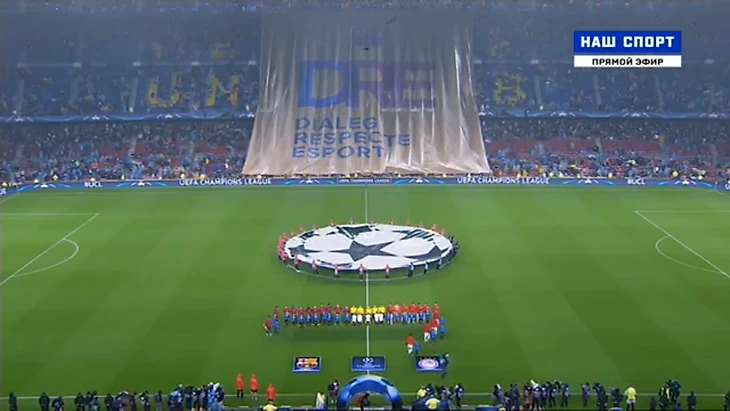 «Диалог, уважение и спорт». Перфоманс болельщиков «Барселоны» на матче Лиги чемпионов