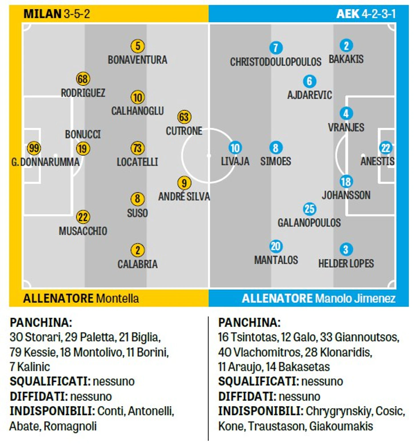 Восстановились от своих повреждений Риккардо Монтоливо и Никола Калинич – оба футболиста начнут сегодняшнюю игру на скамье запасных. В запасе также фигурирует и опальный Габриэль Палетта.