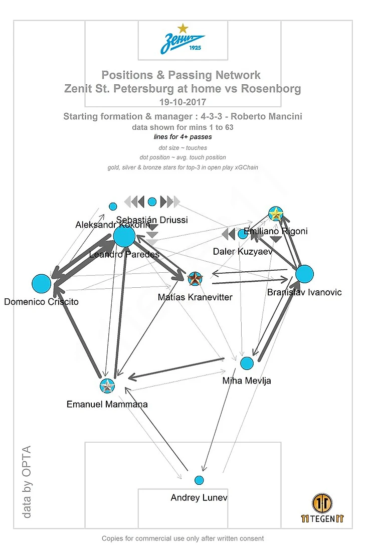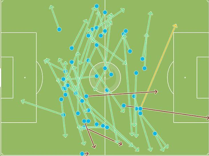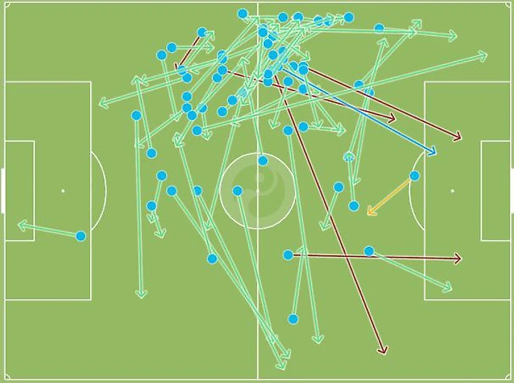 О необоснованной критике Дриусси, аргентинец сыграл отлично по движению и был заменен исключительно из-за тактической перестановки, кого-то надо было принести в жертву под укрепление полузащиты и воздуха. На карте передач и положений видно, что Дриусии как бы отрезан от остальной команды, но это ожидаемо и следует правильно трактовать, а именно, начинали матч по схеме 4-5-1(с Дриусси на острие), плюс полностью выпали 20 минут после первого забитого гола, итог - такая схема передач, основанием для критики и оценки она не является.