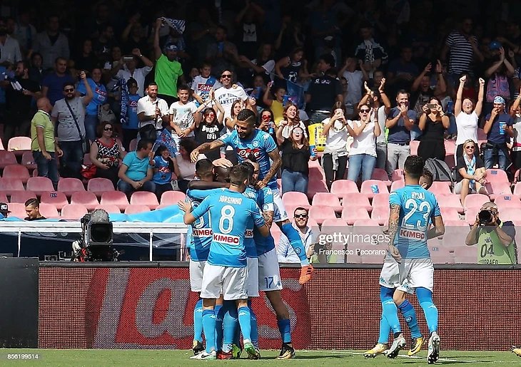 Как же мы без «Наполи». Это обычный розыгрыш в билдапе, но ситуация развивается. Игрок на мгновение вышел из-под прессинга, получил мяч в более высокой позиции и может двигаться с ним дальше, видя при этом партнёров впереди.