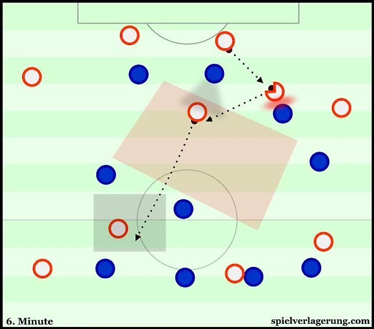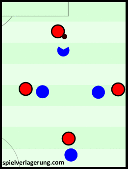 Использование слепых зон чаще всего встречается в фазе билдапа при вертикальном построении атак. Как упоминалось ранее, мяч является важным ориентиром, когда футболисты выбирают позицию на поле. Расположение мяча говорит обороняющимся насколько опасна атака и какое действие нужно предпринять чтобы предотвратить угрозу. Если упростить футбол в обороне до одной единственной задачи, то это будет препятствие попаданию мяча в сетку. Поэтому необходимость видеть мяч так важна.