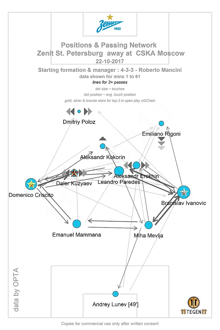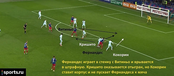 Перейдем к частностям, впервые за долгое время статья Дорского вышла до нашей, грех не приложить вырезки из текста Александра: «Зениту очень не хватало Себастьяна Дриусси, который почти всегда прекрасно прессингует (лучший форвард РФПЛ по количеству отборов и перехватов). Снизить активность Фернандеса в середине первого тайма Манчини решил за счет смены позиций Полозом и Кокориным (Александр отправился на фланг). Решение итальянца помогло гостям – за последние 15 минут тайма Фернандес всего 1 раз коснулся мяча у штрафной «Зенита» и нанес 1 удар, который заблокировал Маммана.». Крайне показательный момент произошел на 40 минуте (на скриншоте), когда Кокорин не просто прочитал рывок Фернандеса за спину Кришито, но и грамотно поставил корпус, а после этого сделал мастерский пас назад вместо выноса под прессингом того же Фернандеса.