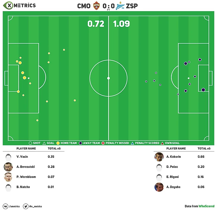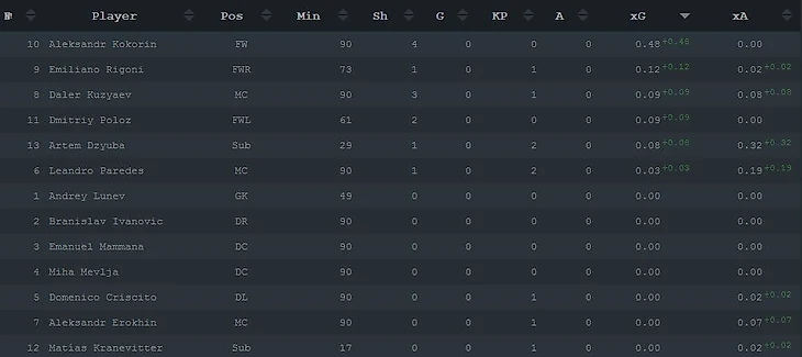 Кокорин после перевода на фланг по ходу встречи начал возвращаться к жизни, стал лидером по набранному xG – 0,48 и количеству ударов – 4. Но еще ярче проявил себя Дзюба, за 29 минут он стал лидером по xA (ожидаемые голевые ) с огромным отрывом – 0,32, лидер по ключевым передачам на пару с Кришито, и сам Артем имел неплохой момент на 84ой минуте, но пробил головой мимо. Естественно отметился Артем и в общей потасовке, резонно посчитав, что Натхо не его весовая категория, переключился на Вернблума, который уже вовсю брызгал слюнями в разные стороны…в общем, улетел швед после толчка довольно эффектно, можно было даже успеть исполнить какой-нибудь акробатический кульбит. А самое забавное, что после всего этого эта парочка посмеялась друг другу в лицо и разошлась, тафгаи они такие.