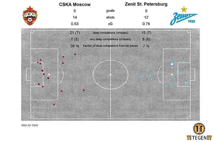 3. Ставка на стандарты. То с каким откровением ЦСКА искал любые стандарты у наших ворот просто поражает, создавать численное преимущество на фланге, выводить летящего игрока к лицевой линии и все только ради того чтобы заработать угловой, вдвойне странная ставка, учитывая, что Зенит – лидер всего европейского футбола по проценту выигранных верховых единоборств, а в целом в xG таблице по стандартам мы выше армейцев...но тут была и другая подзадача, разбить игру на паузы (каждый угловой или штрафной это длительная подготовка), сбить темп, ни для кого не секрет, что ЦСКА не выдерживает весь матч даже скорости РФПЛ(а потом мы удивляемся Базелям), во вчерашнем матче они выдохлись уже к концу первого тайма. Все это мы подкрепим фитнес-статистикой в следующей части разбора.