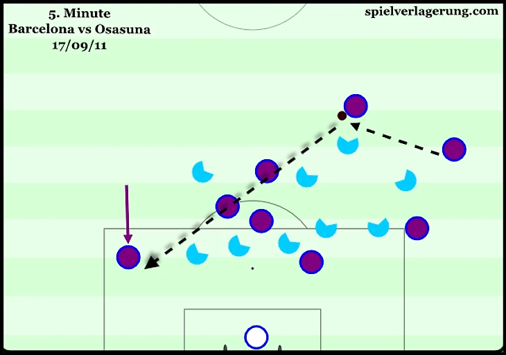 Пеп Гвардиола часто пользуется слепыми зонами, когда переключает игру из полупространства в полупространство. Его крайние защитники играют выше и уже обычного. Это позволяет не только быстро менять акцент атаки, но и перевести мяч на игрока, который хорошо видит поле и может отдать передачу на ход в штрафную.