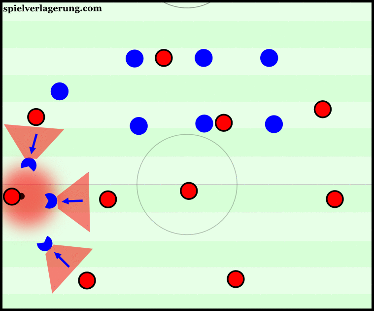 В таких ситуациях атаккующих игроков имеет важное значение. Если они хорошо поддерживают владеющего мячом, то прессинг окажется бесполезен. Смотрите пример ниже.