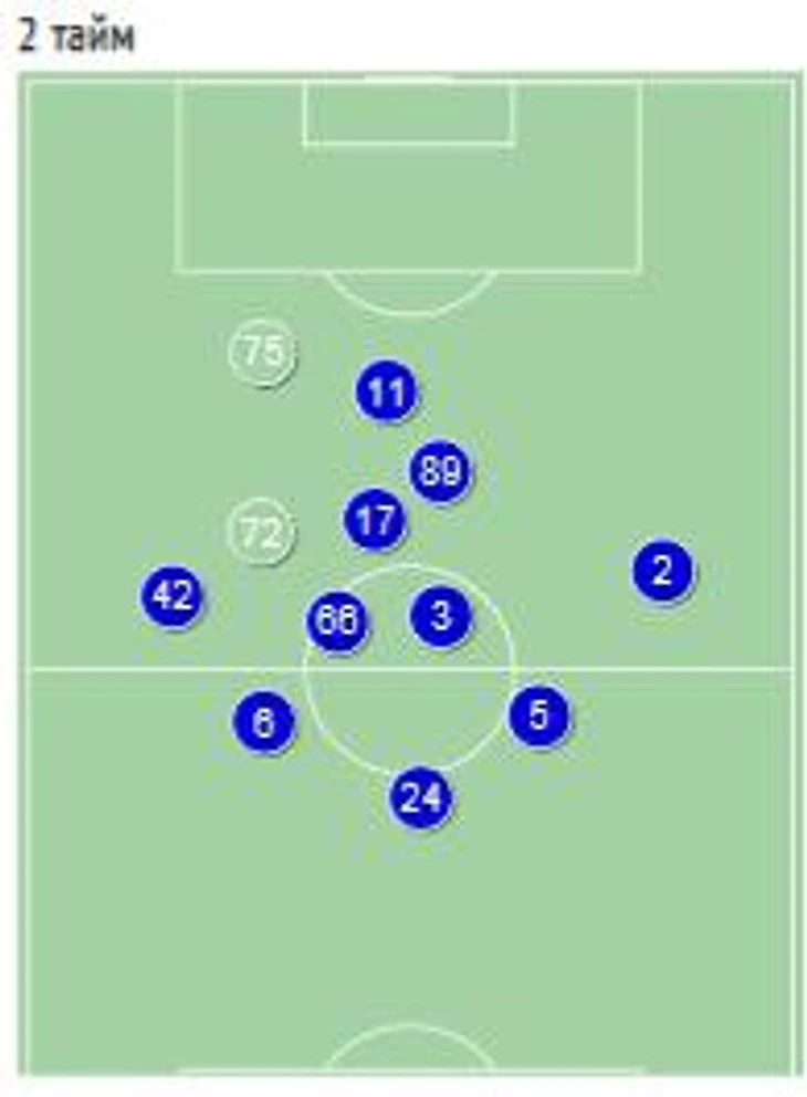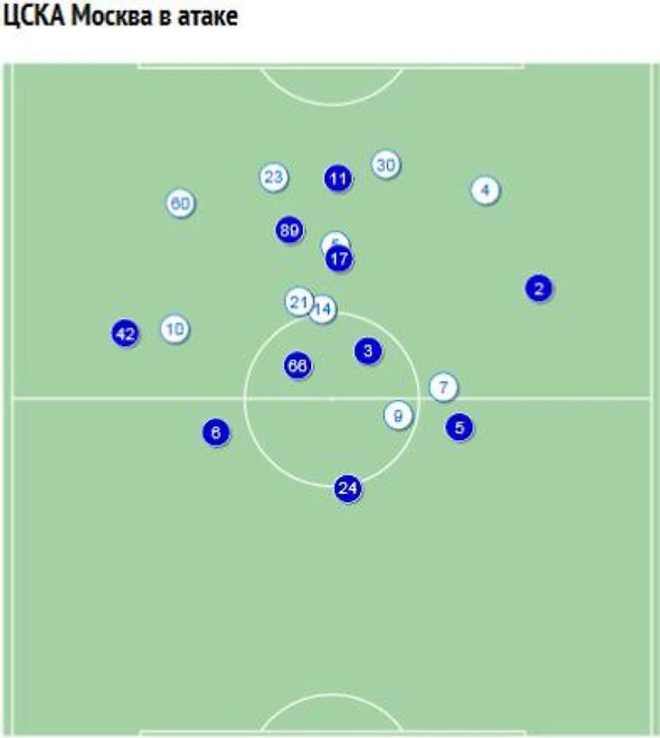 Схема положений ЦСКА в атаке, видно, что сразу трио игроков находится в непосредственной близости от Паредеса, при этом оба наших ЦЗ скованы своими игроками и подстраховать проваливающегося Паредеса уже некому. Если бы армейцы отошли от своей ставки на стандарты, то вероятнее всего гол пришел бы отсюда. Слегка удивительно, что Гончаренко как искусный тактик не внес своевременные коррективы.