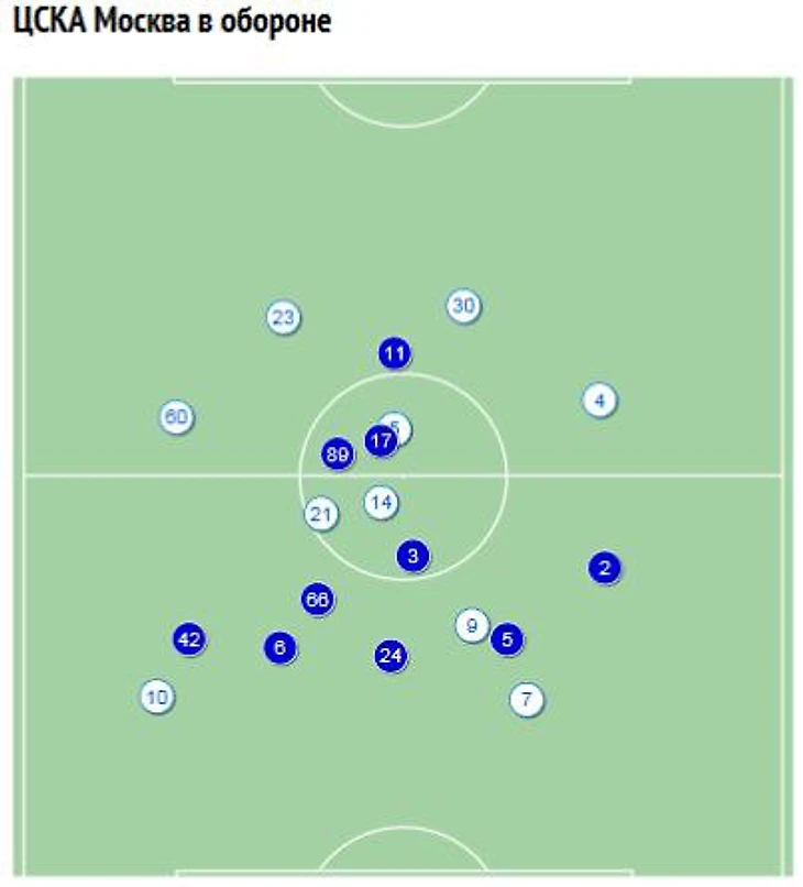 Продолжаем разбор матча с ЦСКА(1, 2). Посмотрим на схемы средних положений игроков при обороне ЦСКА, видно, что группа нападения Кокорин-Полоз-Ригони полностью отрезана, как прикажите играть кроме как вертикалями? Никак, это еще один довод ошибочности стартовой 4-3-3.