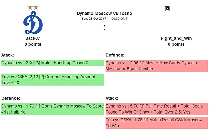 Увлекательная игра должна пройти между Jack07 и Fight_and_Win. Постреляв коэфами, Jack должон уже успокоится и начать делать заносы, а Файт на самом деле хорошо играет, немного ему не везет с возвратамии как следствие потеряннаяи очками, но прогресс на лицо, Файт явно играет лучше чем в прошлом сезоне, молодец Файт !