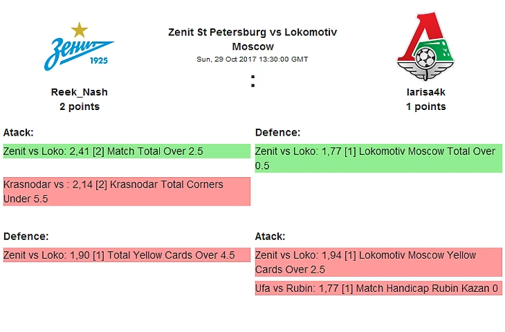 Очень интересная игра пройдет между Зенитом и Локо, игра практически за золото можно сказать, поэтому очень интересно какие ставки выставят Reek_Nash и larisa4k чтобы доказать свое преимущество на нашей ставочной поляне, пожалуй это будет одна из тех игр РФПЛ которую действительно хочется посмотреть ради футбола, а не боления за своих. Давайте парни, жду интересных ставок и заходов !