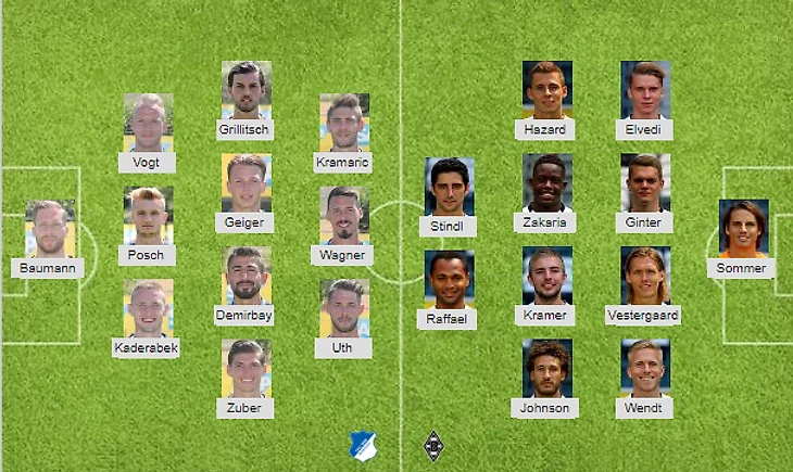 Возможные потери: Хоффенхайм: Бичакчич, Б. Хюбнер, Жуль, Гнабри, Салаи / Боруссия М: Дукуре, Бенеш, Крамер,Штробль, Бобадилья, Дрмич, Вильяльба