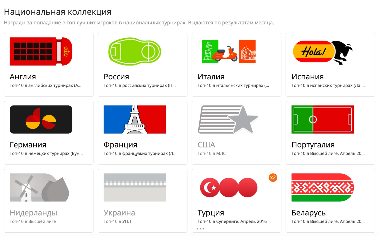 Вы получаете фирменный значок за попадание в топ-10 месяца в лигах по странам. Здесь нет разницы, чемпионат или кубок. Они объединяются: премьер-лига и Кубок Англии – это просто Англия, Серия А и Кубок Италии – Италия. Стикер можно выиграть несколько раз. Те значки, которые вам еще предстоит заполучить, остаются серыми.