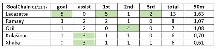 Кроме того, любопытно взглянуть на показатели GoalChain (гол + пас и последние три предголевые передачи):