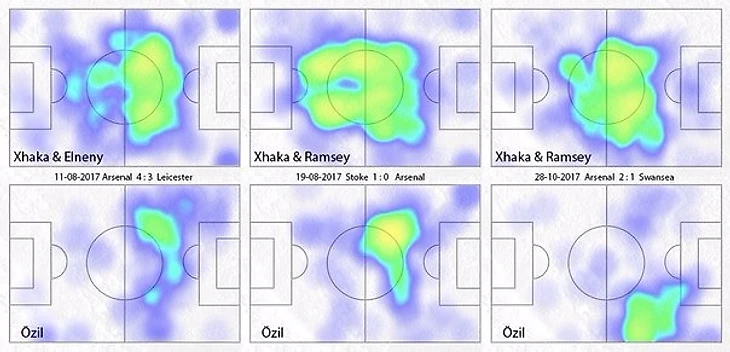 Это также можно увидеть на тепловых картах, например, в матчах против Стока и Лестера, где средняя позиция Озила пересекается со средней позицией Джаки, Эльнени или Рэмзи. Справа – прошедший матч десятого тура с Суонси, Месут Озил не только меняет фланг, но и располагается несколько выше.