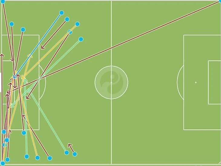 Манчини упорно пытается выстроить 4-5-1 с упором на фланги и навесы, но как это можно сделать если полностью выпадает один из флангов? Пара Ригони Смольников за весь матч сделала только один точный кросс на 94ой минуте, который к счастью стал голевым. На деле же это выглядело еще хуже, Смольников при навесах, не видит где партнеры, а подает, еще более бестолково перебивая нужные зоны метров на 15-20. Самое грустное, что кроме навесов мы не создали ничего, смотри карты ключевых передач и навесов.