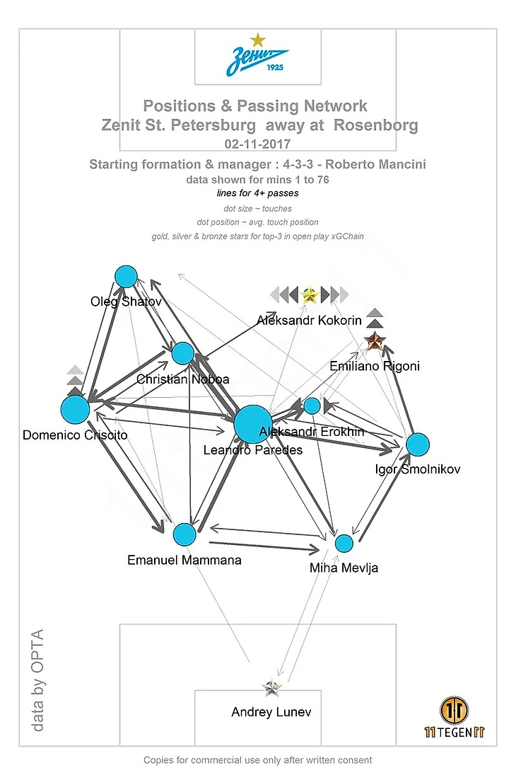 Именно такая природа сложившегося спада напрашивается в первую очередь, да, мы знаем и доказали, что в Зените функциональный спад, но это вторичная причина неудач. Нобоа должен был дополнить диспетчерские функции Паредеса своими тонкими передачами в завершающей стадии, добавить вариант вывода игроков на ударные позиции, и с этой задачей не справился. Эквадорец отдал 3 передачи под удар, но все за пределами штрафной и не опасные, отдал всего 2 передачи в штрафную – обе до адресатов не дошли. Зато Кристиан помогал при выходе из под прессинга норвежцев, 80 минут матча они большими силами шли в высокий прессинг выстраиваясь в 4-2-4, это не принесло плодов не в последнюю очередь благодаря Нобоа, но опять же, такой прессинг позволяет быстро отрезать сразу половину команды соперника и уходить почти в контратаку, за весь матч Нобоа лишь единожды помог это осуществить. Больше Нобоа ничем полезен не был в атаке, по вкладу в пассовую активность уступил даже Ерохину (как оказалось это возможно), но зато помогал Паредесу в обороне, сделал 5 отборов (2 успешных), 2 выноса и 2 блокировки, у Ерохина по всем этим показателям нули.