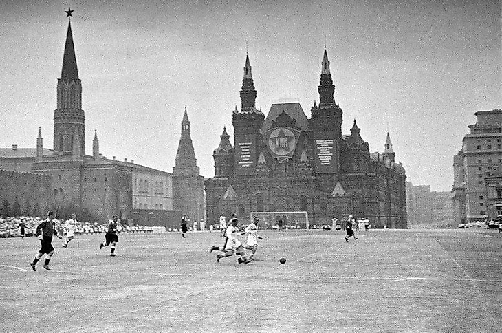Футбольный матч между основным и дублирующим составами «Спартака» Старостина на Красной Площади, 1936. Главный зритель — Иосиф Сталин. Мероприятие дало новый толчок развитии футбола в СССР.