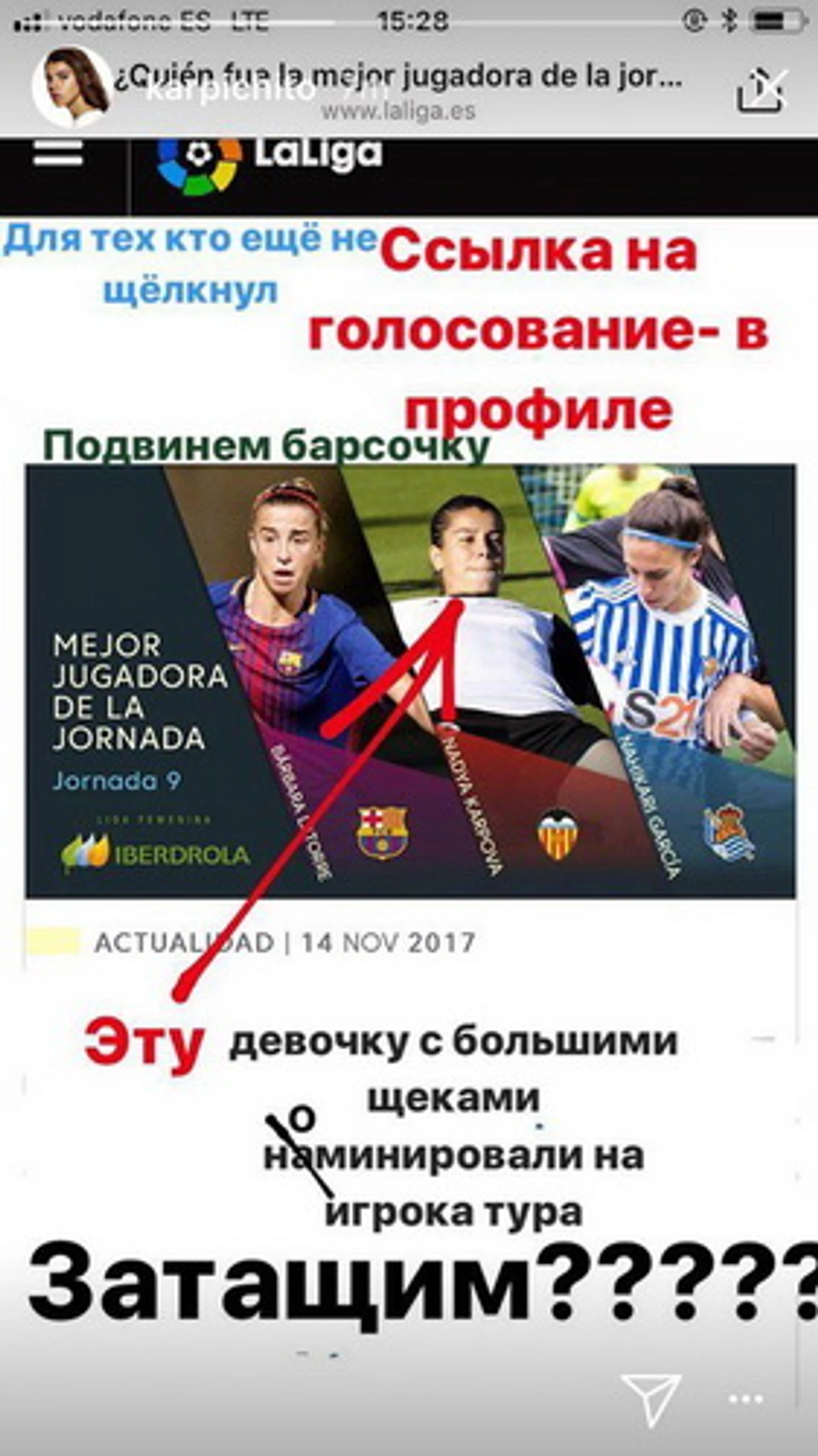 «Подвинем барсочку». Карпова номинирована на лучшего игрока тура в Испании