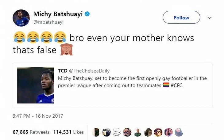 Аккаунт @TheChelseaDaily написал, что Миши Батшуайи признался одноклубникам, что он гей, и стал первым футболистом премьер-лиги, который совершил каминг-аут. Нападающий «Челси» ответил на этот твит и сорвал больше 100 тысяч лайков и больше 60 тысяч ретвитов. Миши написал: «Бро, даже твоя мамка знает, что это вранье».