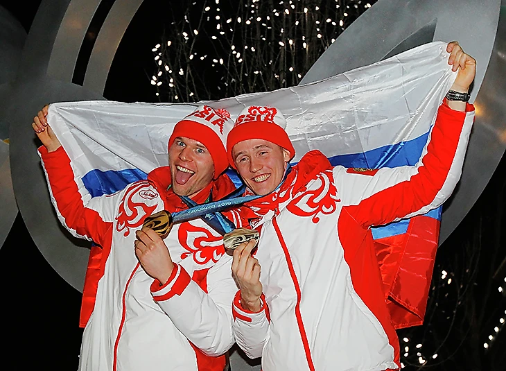 Олимпиада-2010 в Ванкувере запомнилась дублем наших лыжников в спринте: у Никиты Крюкова (справа) – золото, у Александра Панжинского – серебро. А флаг один на всех.