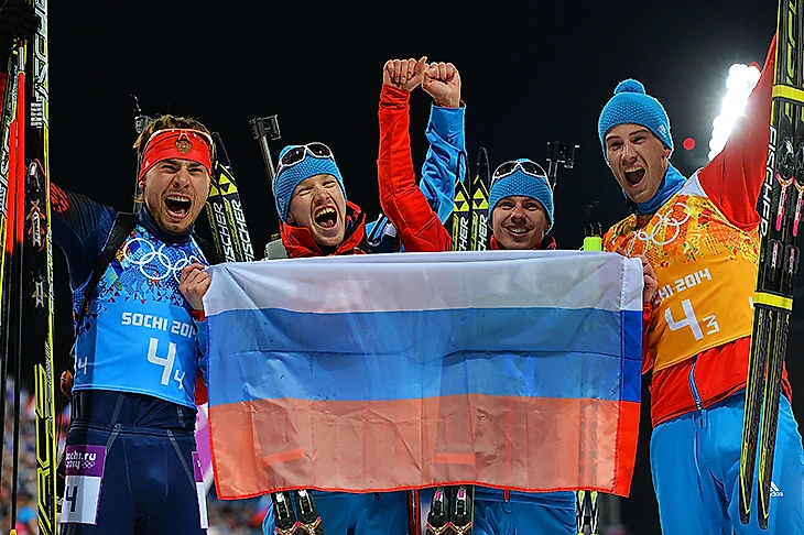 Еще один успех Сочи с флагом: Антон Шипулин, Алексей Волков, Евгений Устюгов и Дмитрий Малышко выиграли биатлонную эстафету. Флаг парням вручили прямо на стадионе.