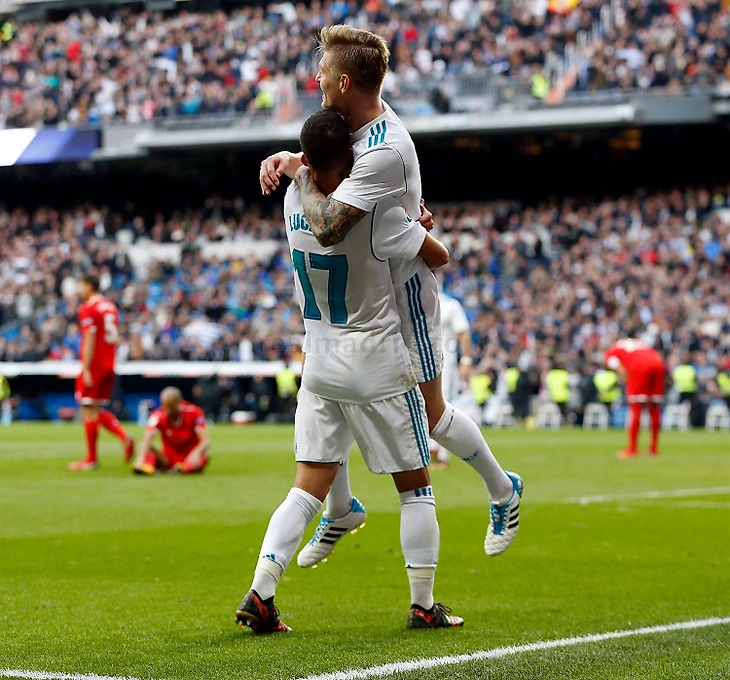 Васкес удачно проявил себя в прошлом матче, вновь вышел в основном составе. Означает ли это, что впредь Зидан будет использовать такое построение против всех клубов Ла Лиги? Вопрос неоднозначный, но скорее нет, чем да. Все-таки сложившаяся тройка в центре поля, отличная игра Иско в последних сезонах, не позволяет заявлять об этом. Но это не означает, что Лукас играет плохо. Он очень старается, проделывает огромный объем работы по всему флангу. Да и в целом является лучшим вариантом для игрока правого фланга при построении 4-4-2. При этом Васкес не "стыдится" возвращаться в оборону. Сегодня совершил 3 отбора.