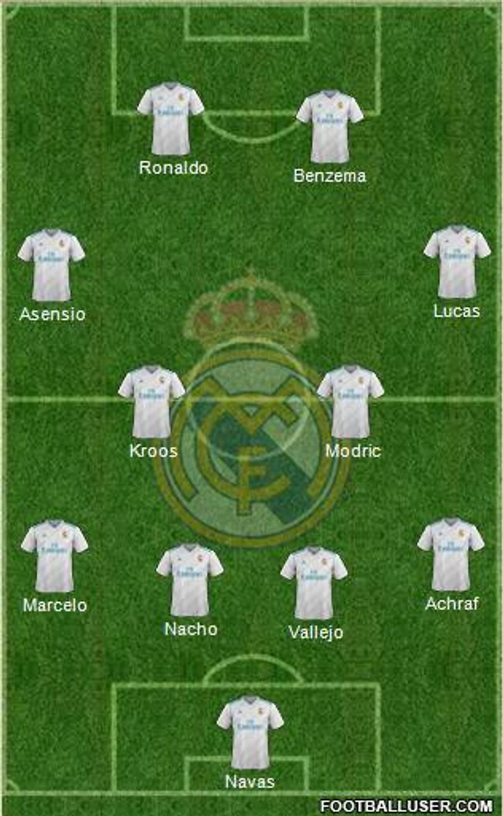 Как вы могли понять ранее, состав был не самым оптимальным. правильнее будет сказать, что состав вообще не был оптимальным. Скорее наоборот. По разным причинам не было Варана, Рамоса, Карвахаля, Каземиро и Бэйла. Расстановка на матч: