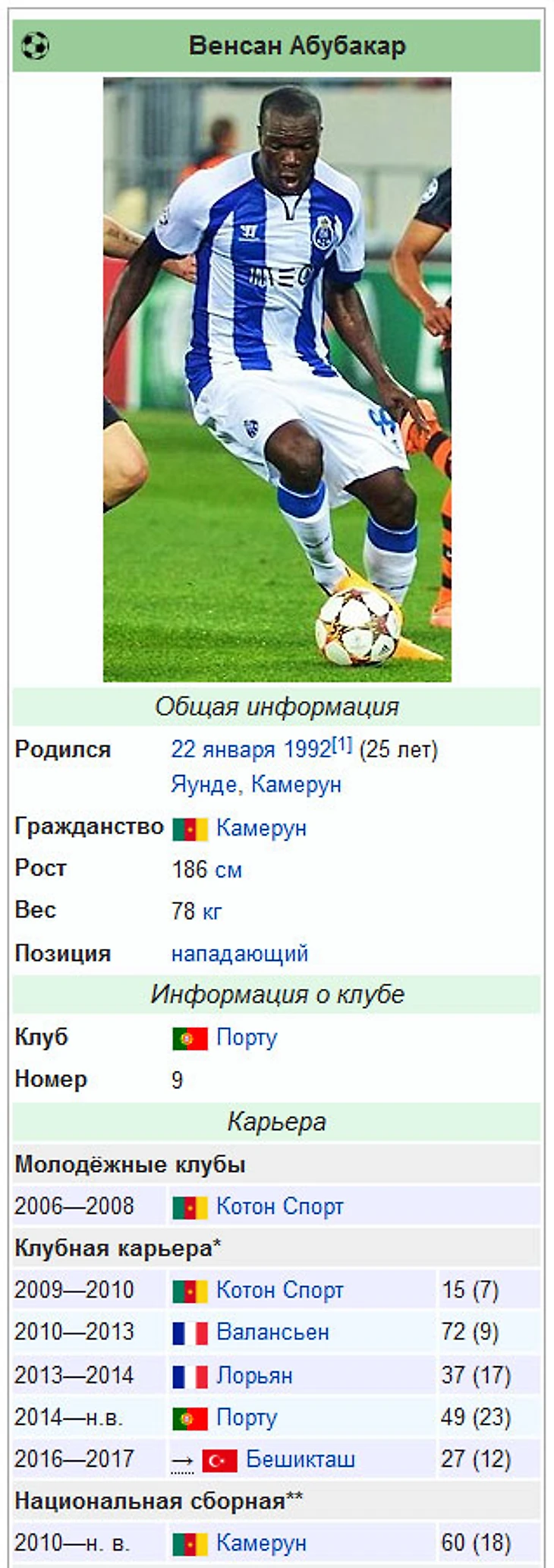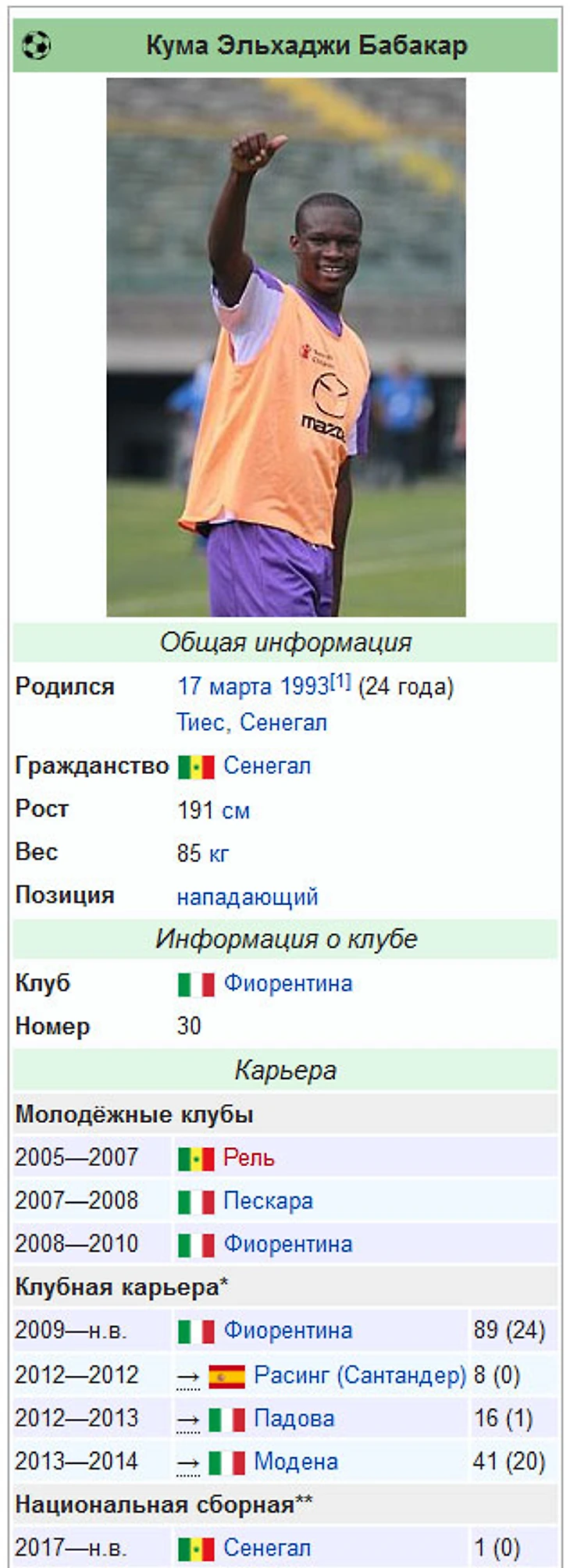 Однако если всё-таки придраться и загуглить, то выходит что Венсан Абубакар никогда не играл в Италии.
