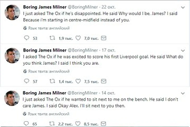 Шутить начали уже над самим Оксом. Boring James Milner подкалывал парня практически каждый тур. Причины были разные: Алекс не раз заявлял, что переходил в «Ливерпуль» ради игры в центре полузащиты «как Стивен Джеррард», а по итогу Клопп выпускал бывшего «канонира» в основном на флангах, а потом еще и реальный Милнер стал попадать в основу как раз на позицию центрального полузащитника. Один из главных юмористических твиттеров футбольной Англии не упустил случая и тут подколоть «одноклубника».