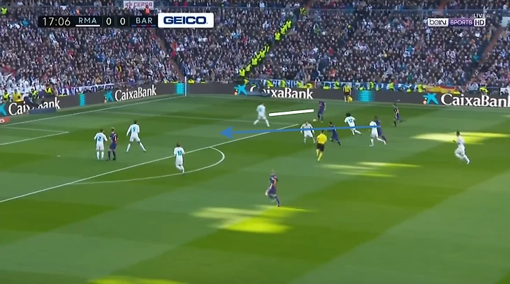 1. Варан играет с Суаресом "один в один", Карвахаль располагается высоко, Иньеста забегает за спину Модричу, Модрич смотрит на мяч, Иньесту не преследует. Создается ситуация "два в один" - Суарес и Иньеста против Варана. К сожалению Бускетс не заметил созданного преимущества в атаке и отыграл мяч назад.