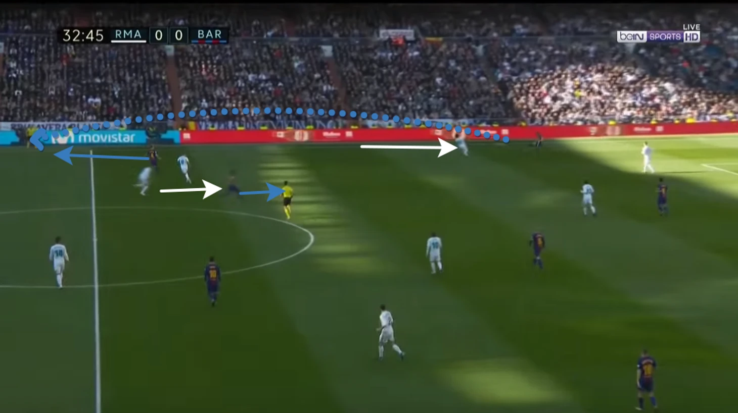 8. Первый гол Барселоны. Опорные позволяют убежать Ракитичу за спину, не преследуют его, свою ошибку не исправляют, надеясь на защитников. Марсело бежит в сторону мяча, предполагая что передача будет на Месси, при этом абсолютно не думает что открывает свою зону и сковывает действия центральных защитников тем, что они не могут встретить Ракитича, а вынуждены закрывать более опасных соперников. В данном случае преимущество образовалось не вбеганием в зону, а дриблингом Ракитича, но суть от этого не меняется: крайние защитники не помогают в обороне, центральные защитники играют один в один.