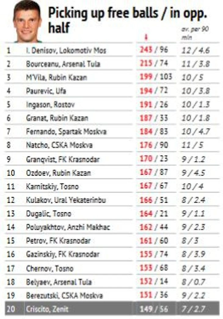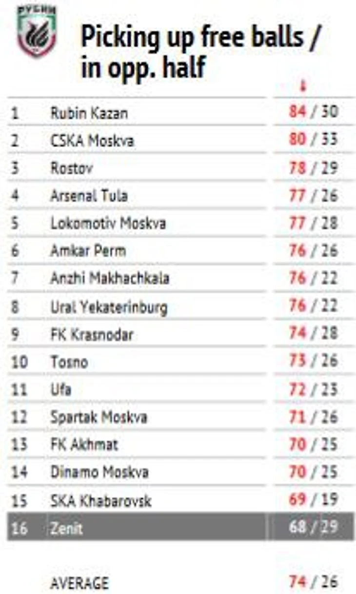 За все хорошее нужно платить, ради такой совокупной защиты, Манчини жертвует зоной подбора, это бросается в глаза и по игре и по статистике, скриншоты 5 и 6. Зенит худшая команда лиги по количеству подборов, а в топ игроков по подборам есть только Кришито на 20ом месте. Ситуация аналогичная и по подборам у чужих ворот.