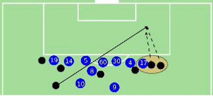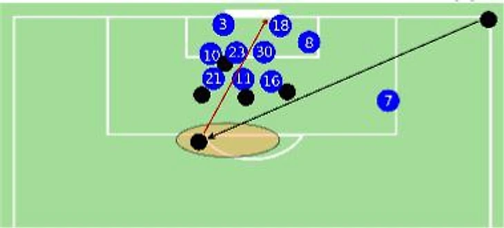 Наибольшую угрозу при штрафных для команды представляют навесы в дальнюю зону. Действующие в зоне крайние защитники упускали своих оппонентов на рывках или проигрывали им верховые единоборства (скриншот).