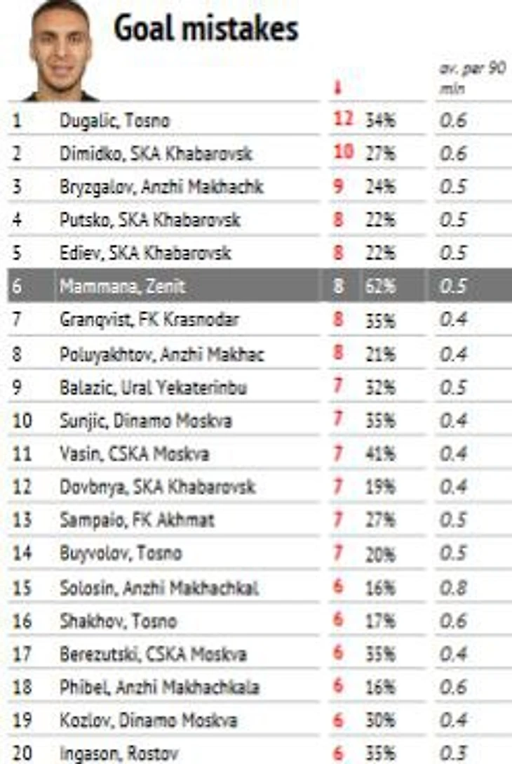 Ложка дегтя, скришнот 4 – голевые ошибки. Маммана совершил аж 8 таких ошибок, при том, что на ворота Зенита было значительно меньше атак и давления чем на ворота игроков соседей по антирейтингу. Далеко идущих выводов пока делать не стоит, не забываем про адаптацию и возраст игрока, будем смотреть дальше.