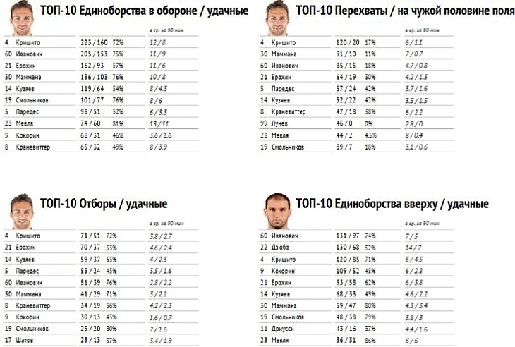 Ну и в завершении, сводная статистика игроков команды по единоборствам, перехватам, отборам и верховым единоборствам, Все на скриншоте 7. Отдельно отметим: по единоборствам с большим отрывом лидируют Кришито и Иванович, Ерохин держится по объемам на уровне ЦЗ (это к слову о его незаметной роли). По перехватам, итальянец и царь и бог, выделим Далера по перехватам на чужой половине, в целом наша звездочка крайне полезна в прессинге и контрпрессинге (если кто-то еще не помолился за здоровье Кузяева, самое время начинать). Ну и откровение, не больше не меньше, Паредес лидер по перехватам на чужой половине – 24 штуки, гуру чтения игры. По отборам выделим Смольникова, небольшое количество из-за малого времени игры и высоких подключений в атаку, но зато 80% удачных, это топовый показатель.
