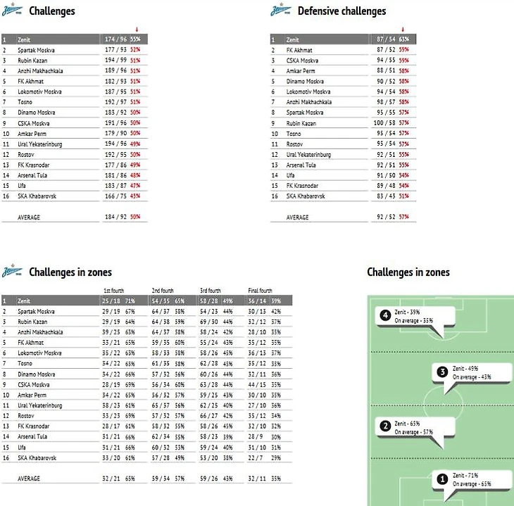 Мы уже писали, Зенит лучшая команда лиги по единоборствам, единоборствам в воздухе и отдельно по единоборствам в защите. Скришот 3 – все единоборства лиги, в том числе с разбивкой по четвертям поля.