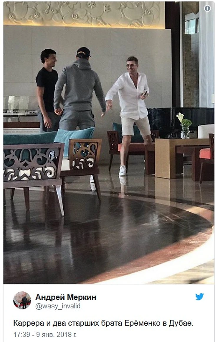 Утром 9 января спартаковцы вылетели на первый сбор в ОАЭ. К возобновлению сезона команда будет готовиться не в самом Дубае, где сейчас отдыхают многие известные футболисты, а в пригороде Джебель-Али. Вчера днём в «Твиттере» появилось фото, на котором в лобби спартаковского отеля Массимо Каррера и Роман Ерёменко жмут руки и общаются с неким человеком, стоящим к камере спиной.