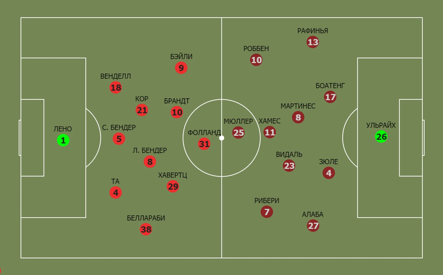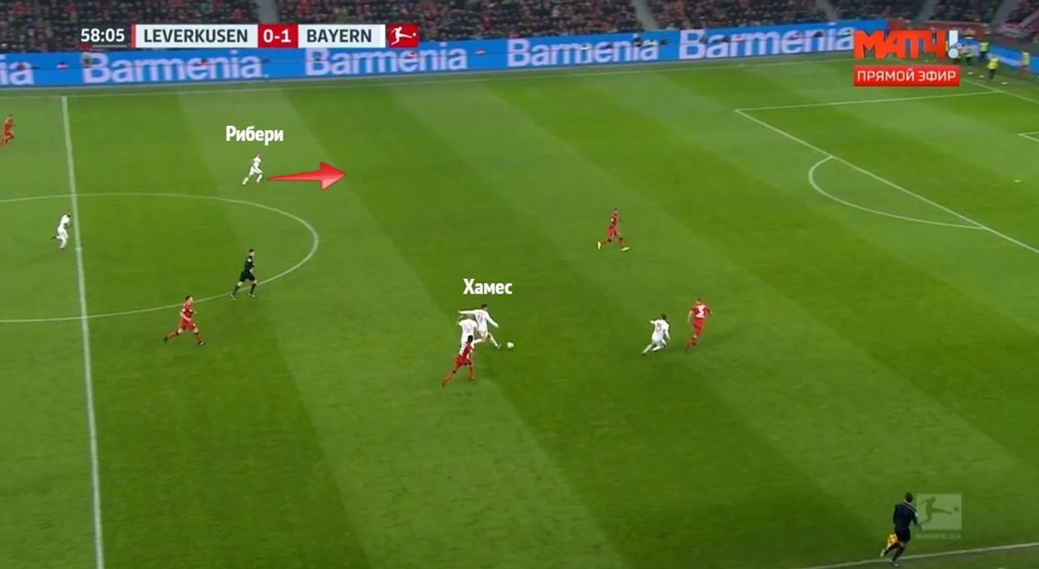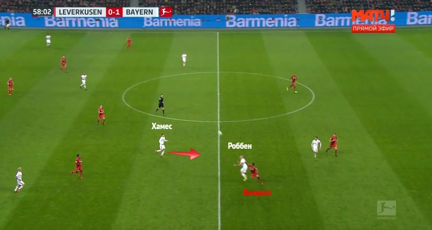 Очень большая свободная зона между линией защиты и полузащиты «Байера». В ней совершенно одни Хамес и Рибери. Длинный пас Ульрайха разрезал прессинг и создал для «Баварии» выход 4 в 3. Затем Роббен скинет мяч за спину Венделлу, выводя на свободное пространство Хамеса. Таким образом получится атака 3 в 2