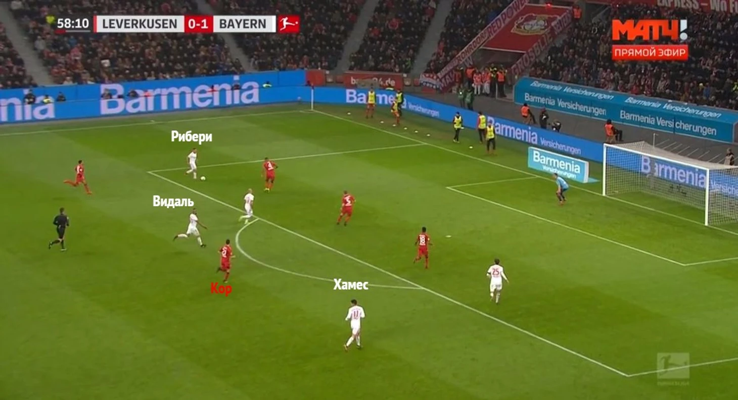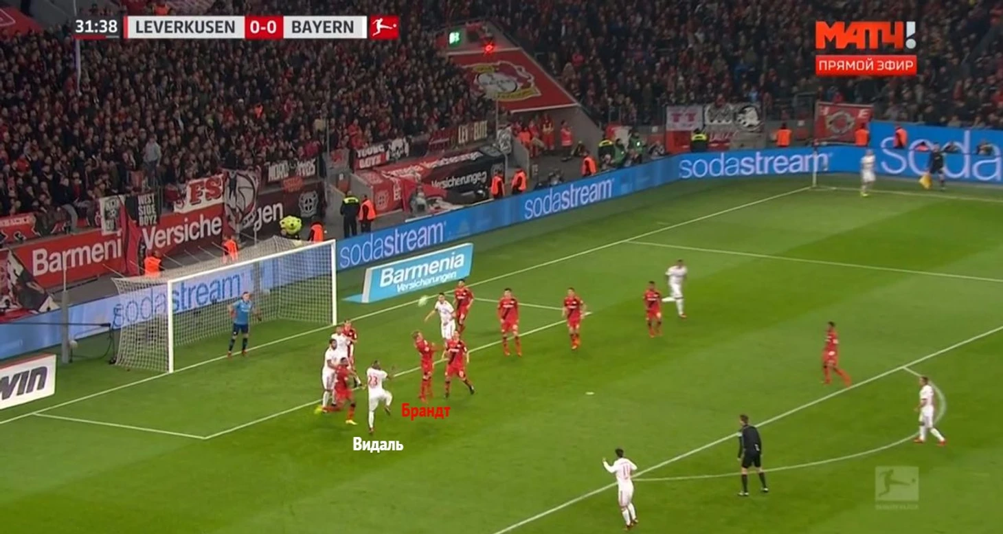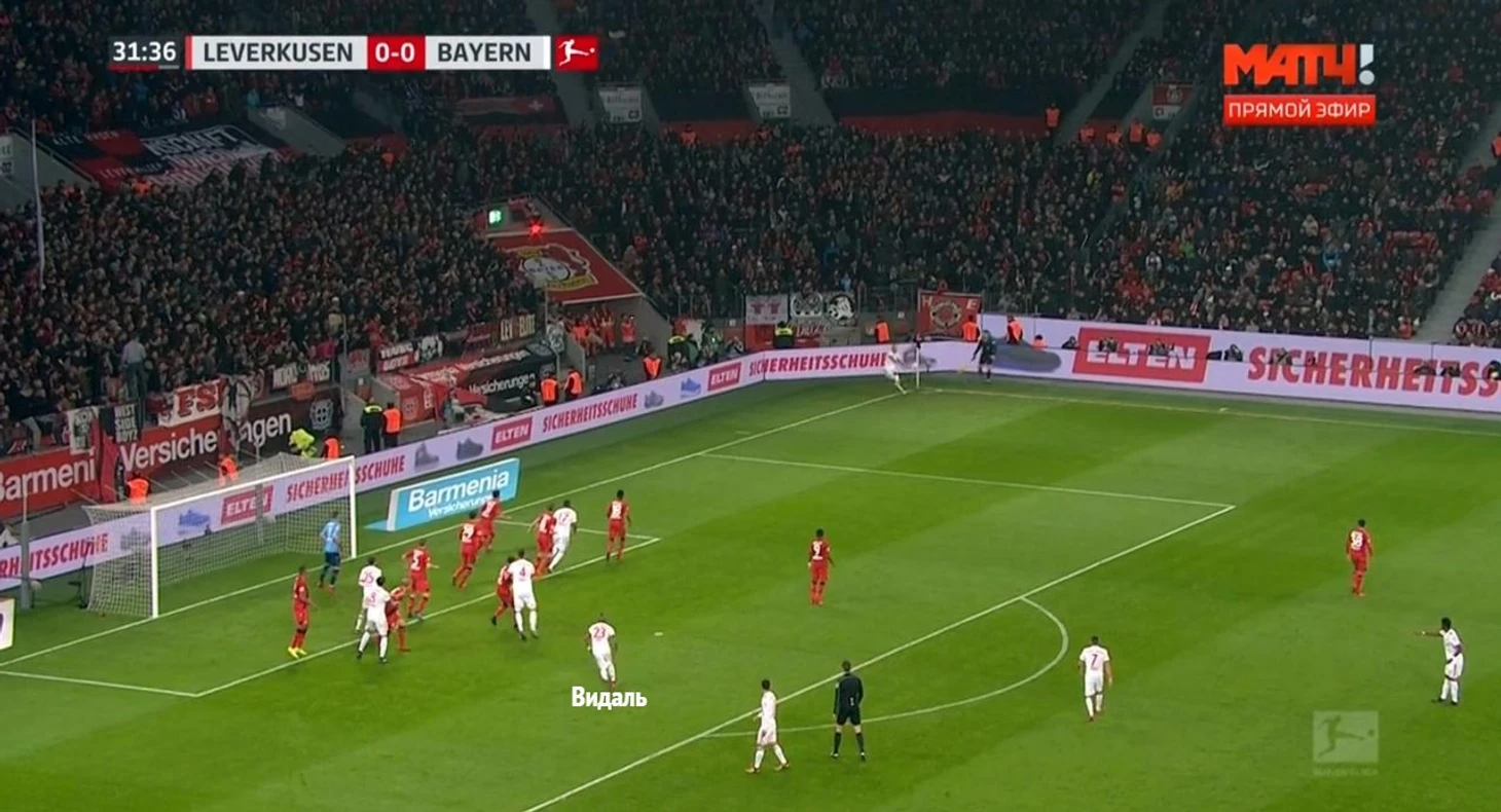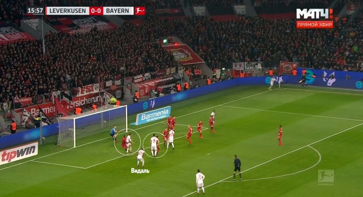 После подачи углового игроки «Баварии» подключаются, Та играет с Мюллером, Кор с Зюле, а в итоге Артуро Видаль остается совсем один на дальнем углу вратарской, при этом на ближнем сразу пять игроков «Байера»