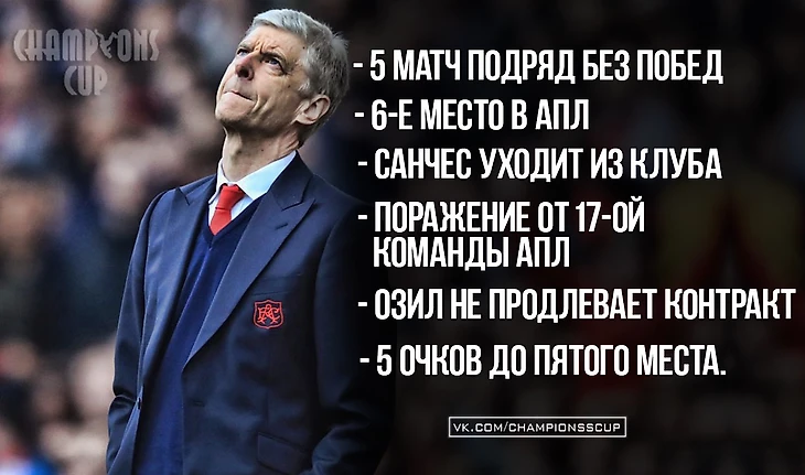 Арсен Венгер без сомнения культовая личность для лондонского Арсенала. Он отдал этому клубу более 20 лет жизни и сделал команду одной из лучших команд не только Лондона, но и всей Европы. Но глупо отрицать деградацию канониров, все к чему Венгер привёл Арсенал начинает разрушаться. Если раньше канониры могли покорить всю Англию ни проиграв ни одного матча, то сейчас от пятого места в чемпионате их разделяет целых пять очков. Говорить о чемпионстве бессмысленно, даже квалификация в Лигу Чемпионов кажется призрачной. Даже в самой Лиге Чемпионов Арсен Венгер мог дойти до финала и достойно выступать, а сейчас приходится играть в скромной Лиге Европы и радужных перспектив не предвидится. Раньше игроки рвались попасть в клуб, а теперь всеми силами пытаются его покинуть. Да и философия самого француза выращивать свои таланты или же подписывать молодых и неизвестных игроков тоже перестала работать. А самое обидное что заклятый враг-Тоттэнхэм выступает лучше.