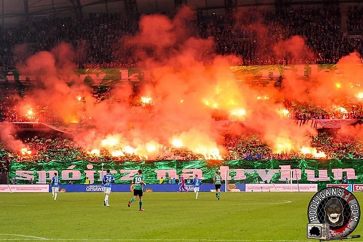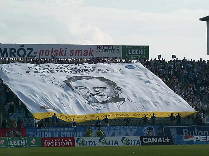 За что "Легию" называют топом? За то, что для неё нет запретных тем в перфомансах. Всегда бьют по самым больным местам и всегда эти удары крайне актуальны. Вот и на этот раз они подготовили баннер с текстом "Вся Познань, хором!" и изображением Войцеха Кролоппа в шарфе "Леха". Одновременно с этим название хора "Познаньские соловьи" стало обидным прозвищем для "лехитов".