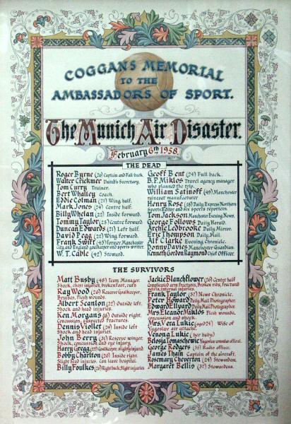 Geoff Bent, Roger Byrne, Eddie Colman, Duncan Edwards, Mark Jones, David Pegg, Tommy Taylor, Liam (Billy) Whelan, Alf Clarke, Don Davies, George Follows, Tom Jackson, Archie Ledbrooke, Henry Rose, Eric Thompson, Frank Swift, Walter Crickmer, Bert Whalley, Tom Curry, Capt Kenneth Rayme