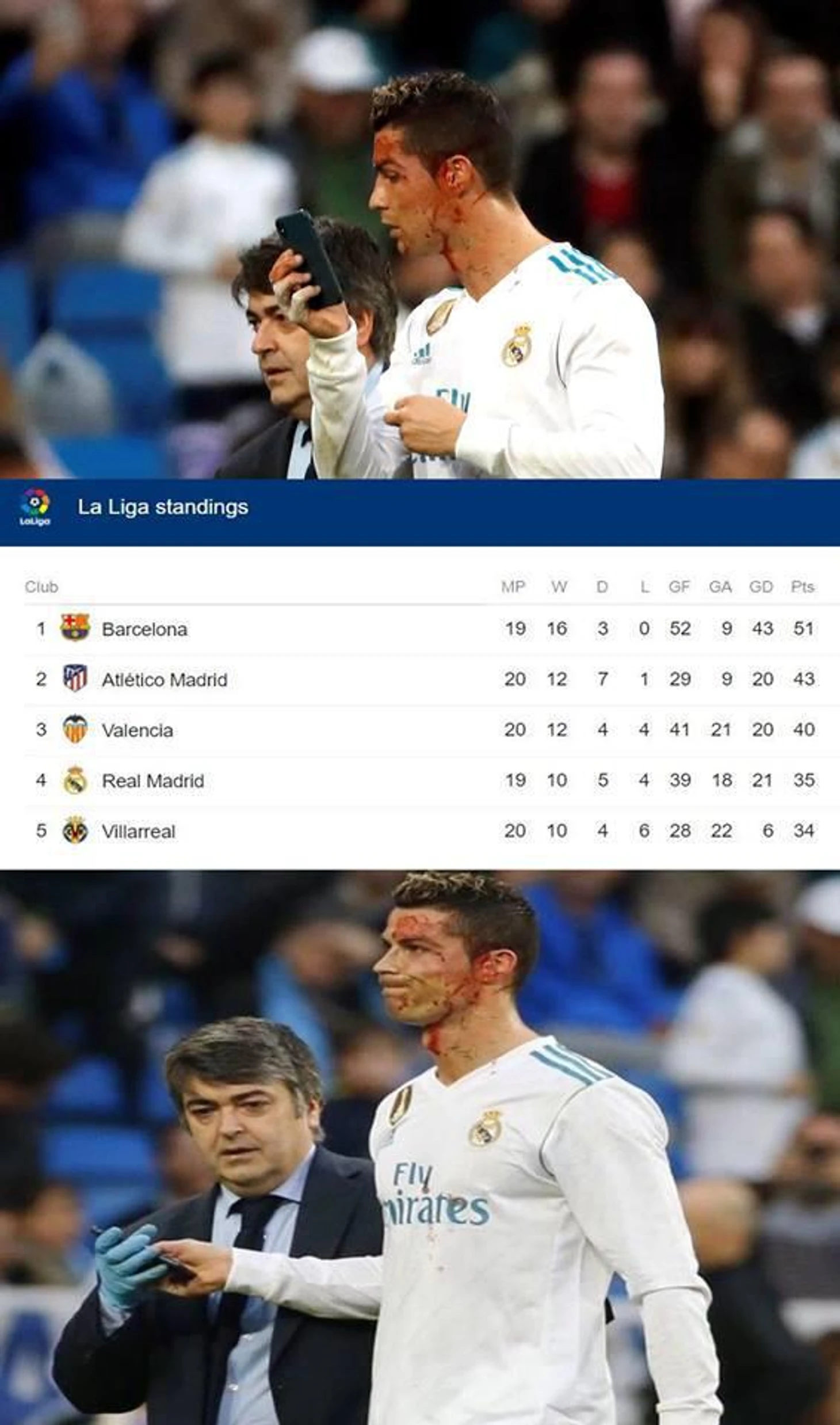 Криштиану поднимается с окровавленным лицом и дублем на своем счету