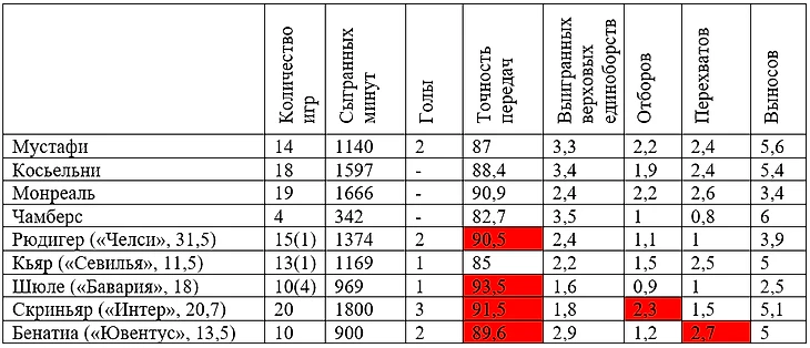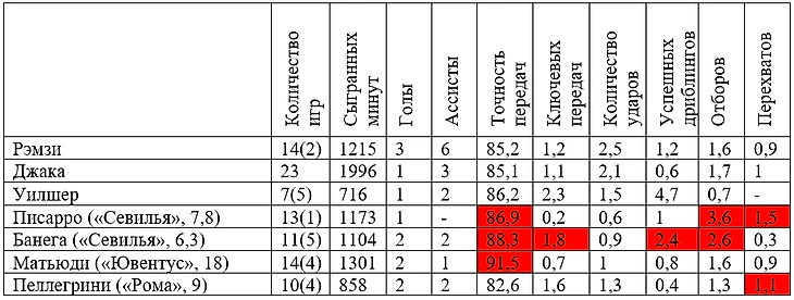 ** красным выделены графы, в которых игроки лучше как минимум двух игроков «Арсенала».