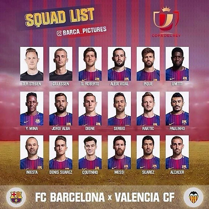 Тер Штеген, Силлессен, Пике, Ракитич, Бускетс, Денис Суарес, Иньеста, Луис Суарес, Месси, Коутиньо, Паулиньо, Алькасер, Альба, Динь, Серхи Роберто, Видаль, Умтити, Мина