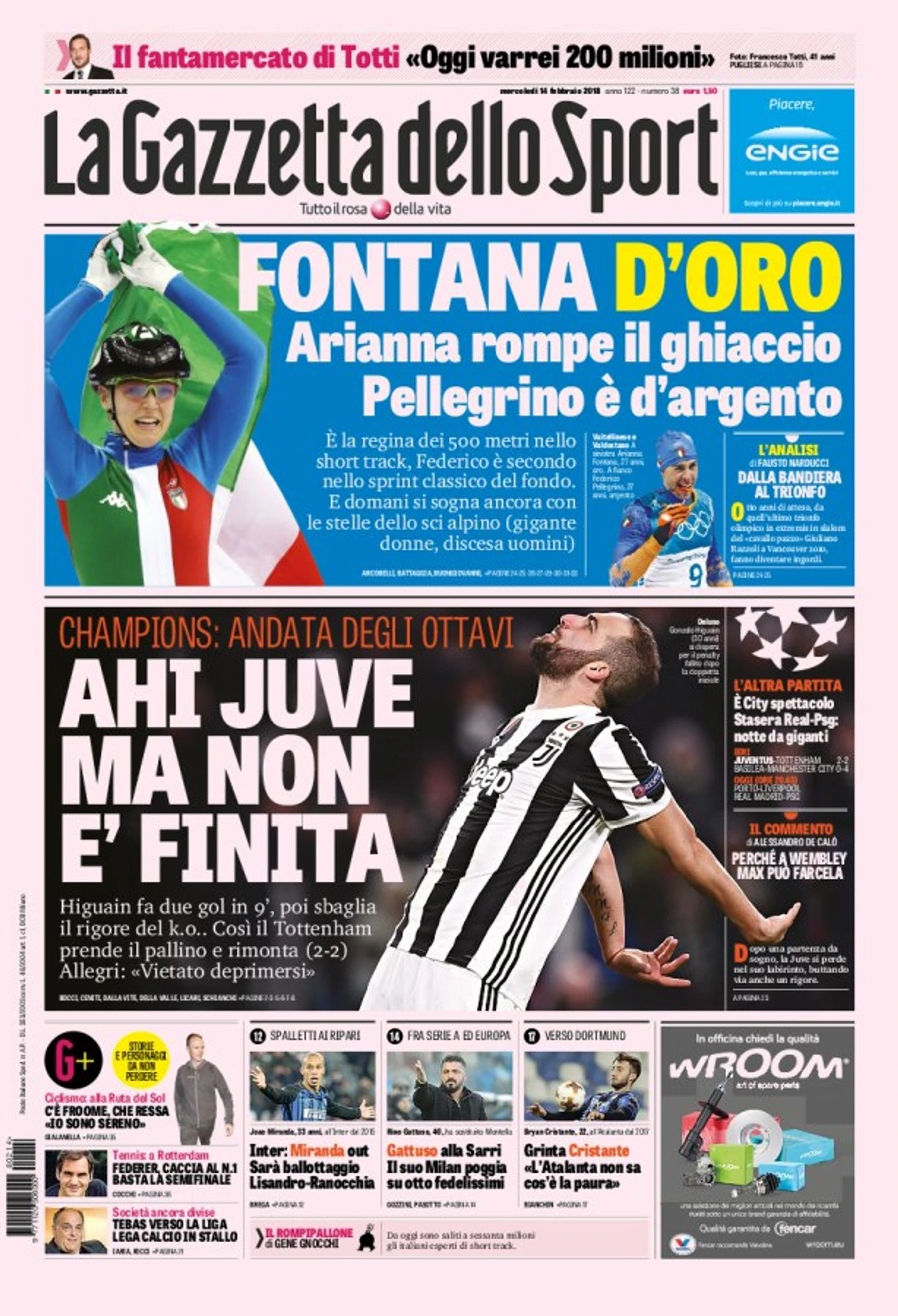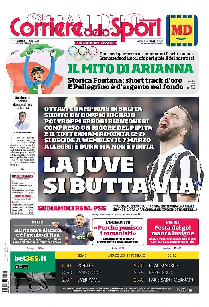 Матчи 1/8-финала начались, сразу дубль Игуаина, затем слишком много ошибок Бьянконери, включая пенальти Пипиты, и «Тоттенхэм» отыгрался (2:2). Всё решится на «Уэмбли» 7 марта. Аллегри: «Это тяжело, но это не конец».