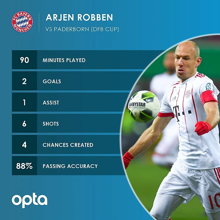 Арьен Роббен оформил первый дубль за «Баварию» с февраля 2015 года, когда со счетом 6:0 был разгромлен «Падерборн».
