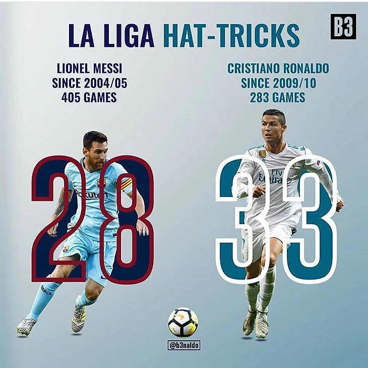 В Ла Лиге у Криштиану тоже нет равных - 33 за 283 матча. Ближайший преследователь - Месси - имеет на своем счету 28 хет-триков (за 405 игр).